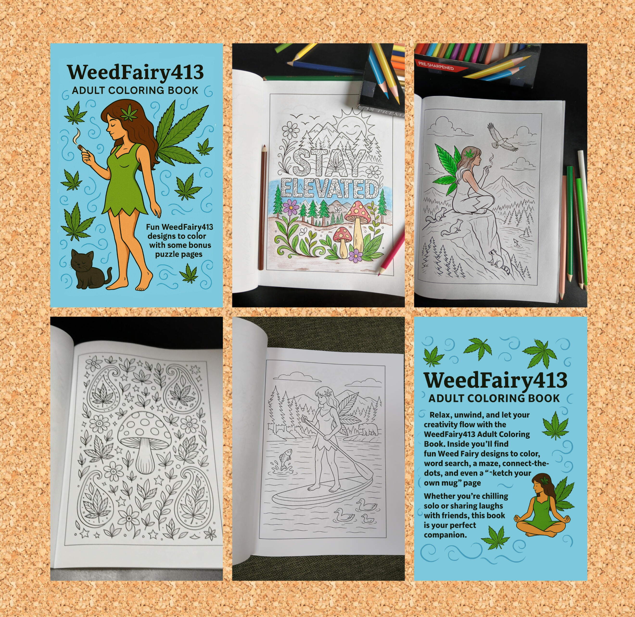 Relax, unwind, and let your creativity flow with the WeedFairy413 Adult Coloring Book!This unique coloring, activity and journaling book includes 28 pages of original WeedFairy413 coloring designs, word search, a maze, connect-the-dots, and even a “sketch your own mug” page. There are also 7 additional bonus journaling pages to put "Higher Thoughts" to paper! Each page is single-sided and designed to bring stress relief, laughter, and high vibes.Whether you’re chilling solo with your morning coffee, sharing a creative night with friends, or searching for the perfect gift, this book is sure to provide an elevated experience!